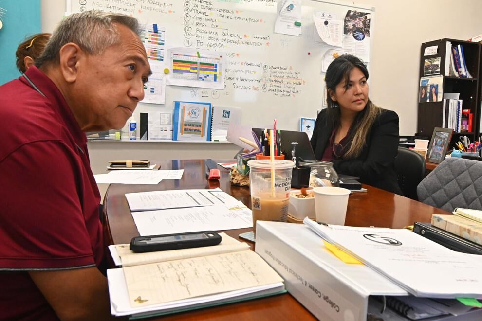 Guahan Academy Charter School Board of Trustees Audit Committee Chair Al Erguiza, left, and CEO Ann Santiago attend the GACS board meeting Tuesday, Sept. 19, 2023, in Tiyan.