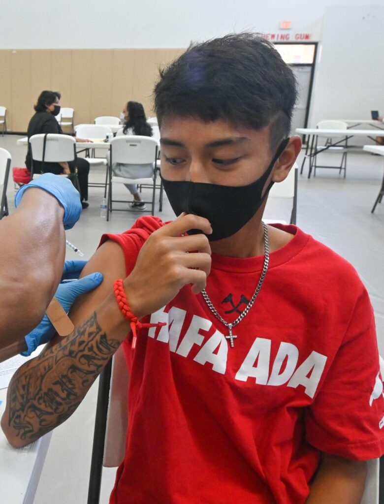 The Guam Department of Public Health and Social Services is making preparations to vaccinate kids ages 5-11 as the nation awaits federal approval of the Pfizer shot for the younger age group. The vaccine is authorized for emergency use for teens 12 and older. In this April 12 photo, high school senior Michael Sampang receives a dose of the Pfizer vaccine at the Tiyan High School vaccination clinic.