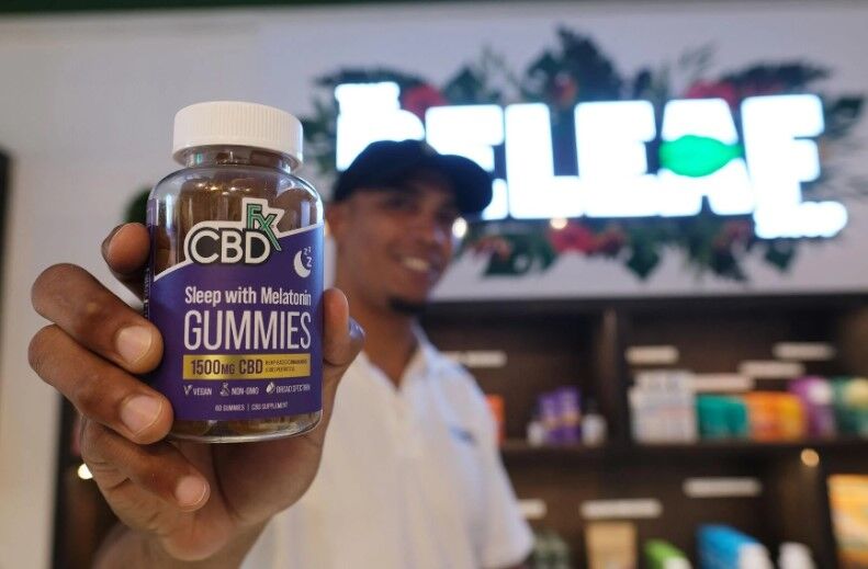 Nick Brown, the owner of the Releaf Shop in Hagåtña, holds a popular CBD sleep aid at his shop on Monday afternoon. By late August, local businesses can begin to apply to legally grow, process and sell cannabis and cannabis-infused products.
