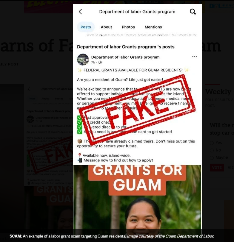 HAGÅTÑA (The Guam Daily Post) — The Guam Department of Labor has issued a warning about a scam on Facebook falsely claiming to offer grants.