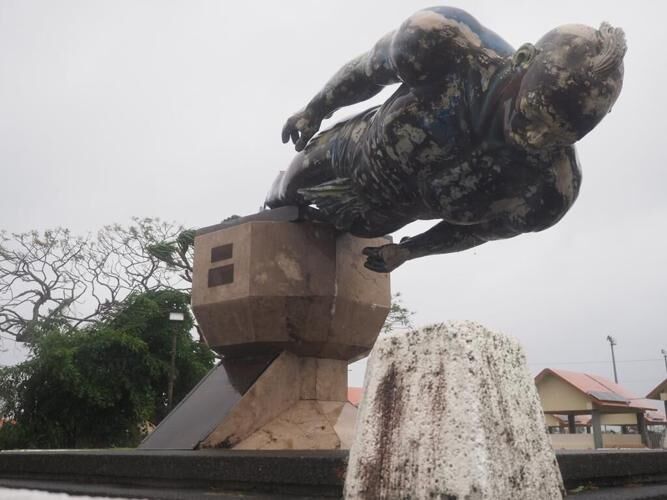 The statue of Chief Kepuha in Hagåtña is seen severely damaged in the aftermath of Typhoon Mawar on Thursday, May 25, 2023.