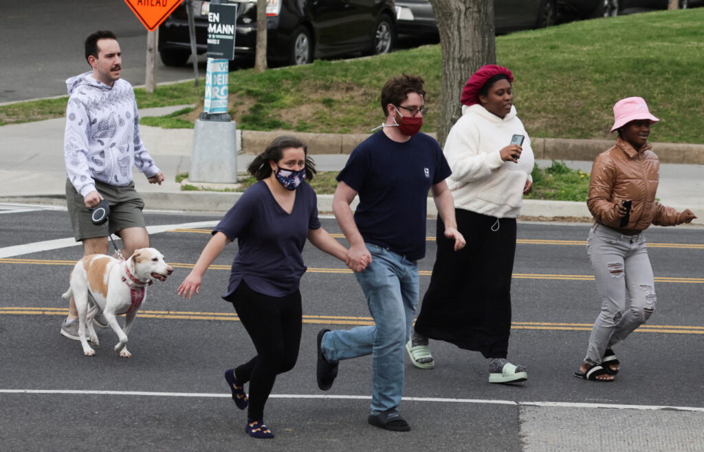 Local residents run to safety as police evacuate people from the area of the scene of a reported shooting and active shooter near Edmund Burke Middle School in the Cleveland Park neighborhood of Northwest Washington, D.C., April 22, 2022.