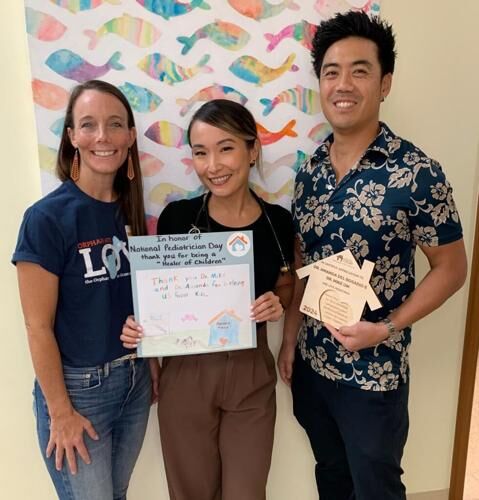 Harvest House Executive Director Bethany Taylor, left, recognizes Drs. Amanda Del Rosario, center, and Mike Um, right, in honor of National Pediatrician Day for the care the doctors provided to foster children.