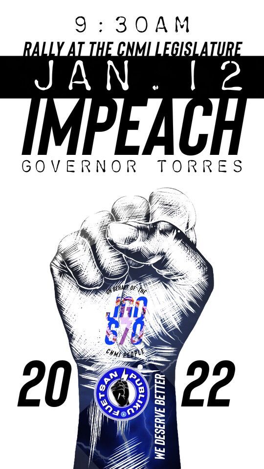 Another image depicted a clenched fist: “Rally at the CNMI Legislature, Jan. 12. Impeach Governor Torres. We Deserve Better.” On the palm of the hand were the following words: “On behalf of the JGO 670 CNMI People. FUETSAN PUBLIKU.”