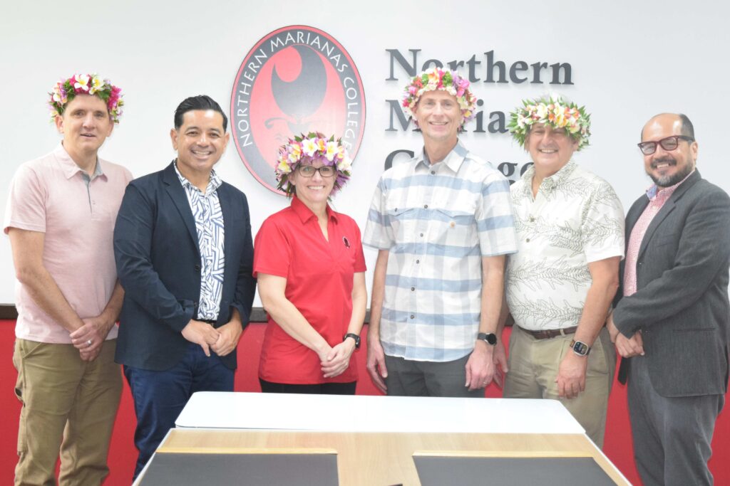 From left, Western Interstate Commission for Higher Education Vice President Patrick Lane, Northern Marianas College Vice President for Administration and Advancement Frankie Eliptico, WICHE President Demaree Michelau, WICHE Chair Matt Freeman, WICHE Immediate Past Chair David Lassner and NMC President Galvin Deleon Guerrero, Ed.D. pose for a photo after the press conference in the NMC Board of Regents conference room on Monday.