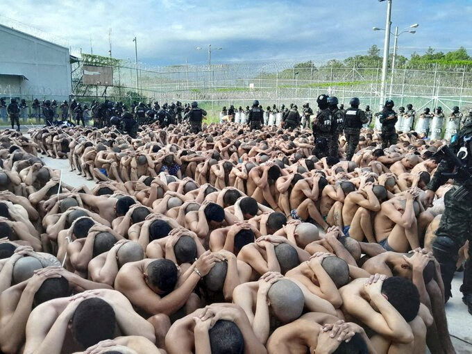 Official video showed hundreds of shirtless male inmates, many tattooed and with their heads shaved, arranged on the floor of Honduras’ high-security Tamara prison with their arms over their heads, guarded by heavily armed soldiers.