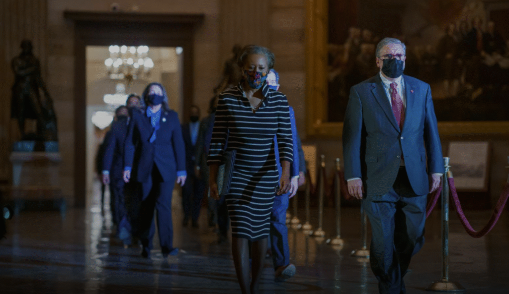 Clerk of the House Cheryl Johnson along with House Sgt.-at-Arms Tim Blodgett lead the Democratic House impeachment managers as they walk through the Statuary Hall on Capitol Hill to deliver to the Senate the article of impeachment alleging incitement of insurrection against former President Donald Trump, in Washington, D.C. on Monday.