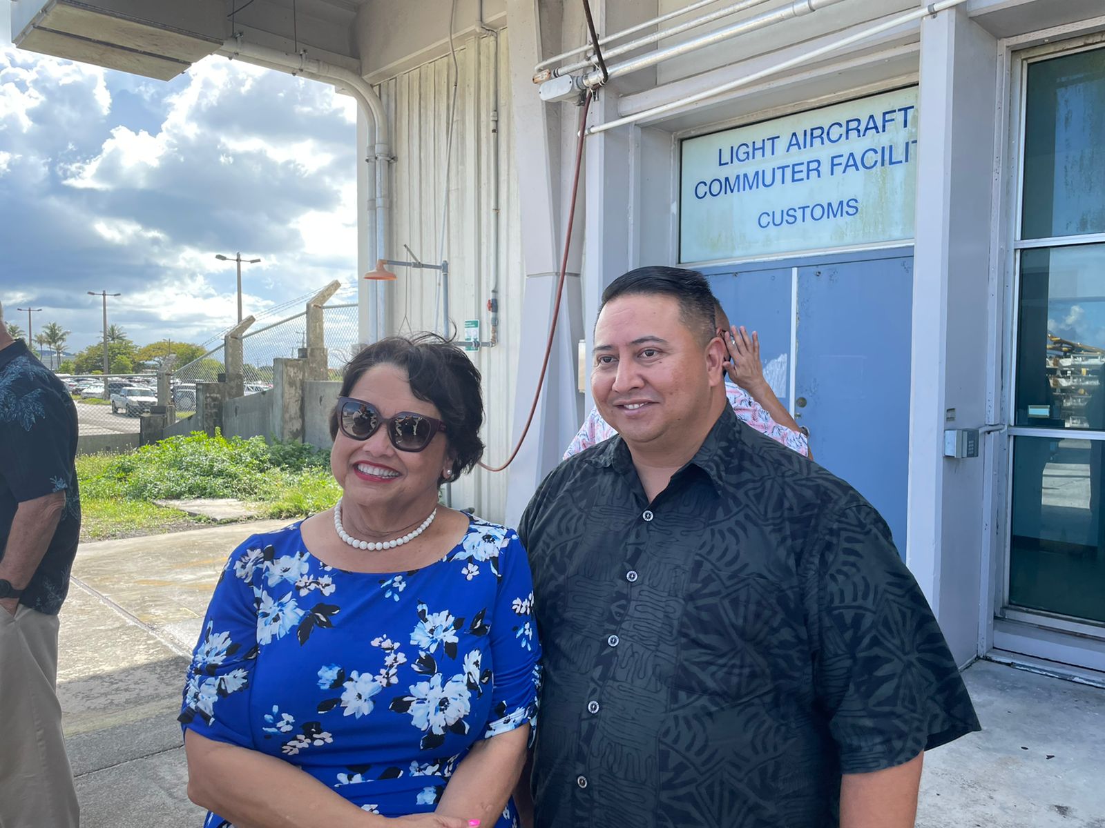 Guam Gov. Lou Leon Guerrero and CNMI Gov. Ralph DLG Torres pose for a photo on Thursday on Guam to commemorate the Marianas Southern Airways’ inaugural Guam-Saipan flight.
