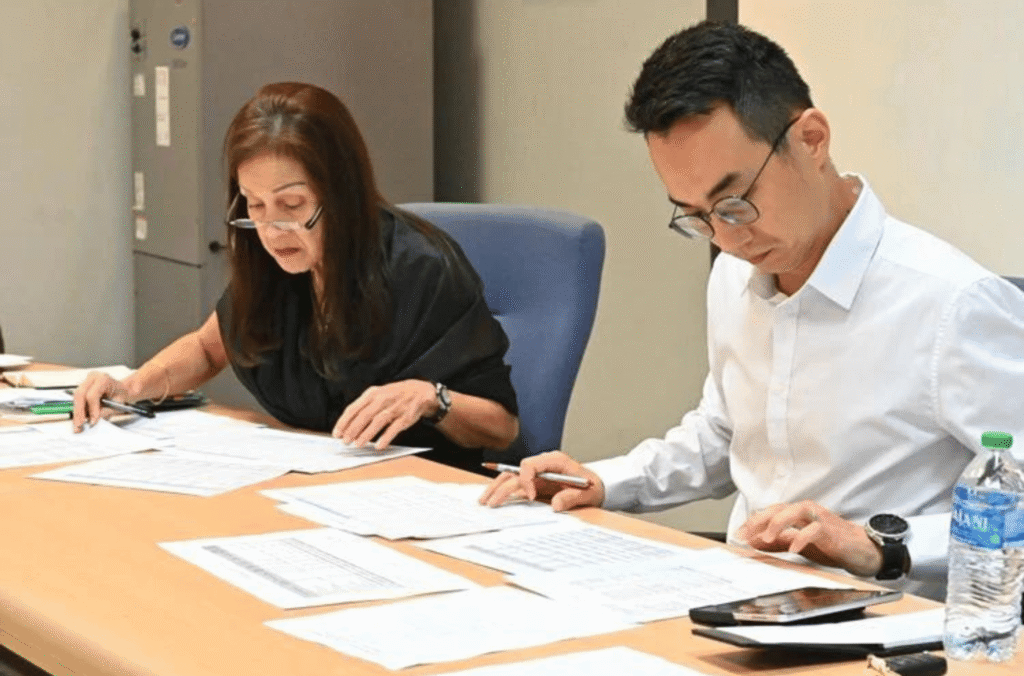 Guam Department of Education Deputy Superintendent of Finance and Administrative Services Joann Camacho, left, and controller Moonsu “Adam” Shin look over financial reports during a meeting on Thursday, Jan. 25, 2024, in Tiyan.