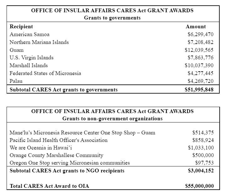 WASHINGTON, D.C. (Press Release) — The U.S. Department of the Interior’s Office of Insular Affair announces its final allocation of $55 million in Coronavirus Aid, Relief, and Economic Security or CARES Act through the Technical Assistance Program to the Insular Areas. The funds were distributed among the insular area governments to prepare for and address the impacts of the global coronavirus pandemic. Funds were also distributed to several non-government organizations in Guam, Hawai’i, and the mainland to assist insular area populations disproportionately impacted by the Covid-19 pandemic.