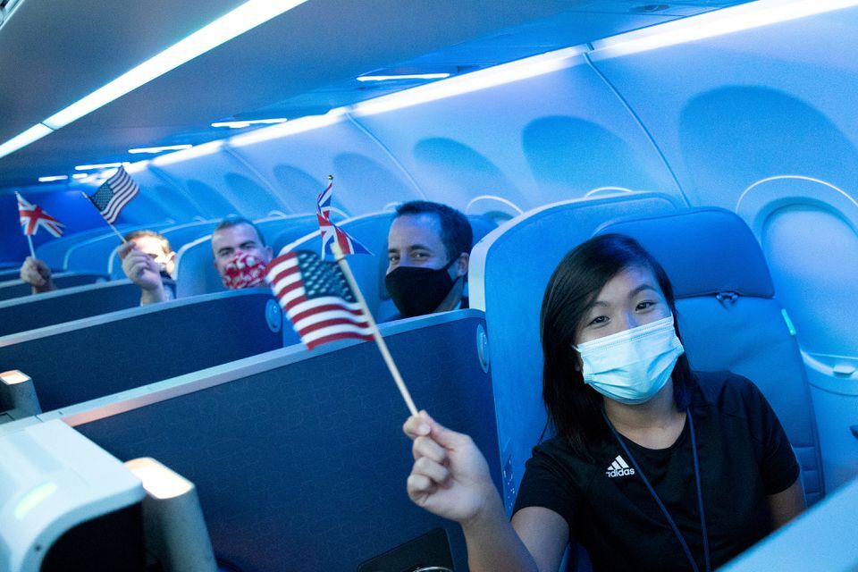 Passengers wearing protective masks hold American and British flags before a JetBlue flight to London at JFK International Airport in the Queens borough of New York City, New York on Aug. 11, 2021.