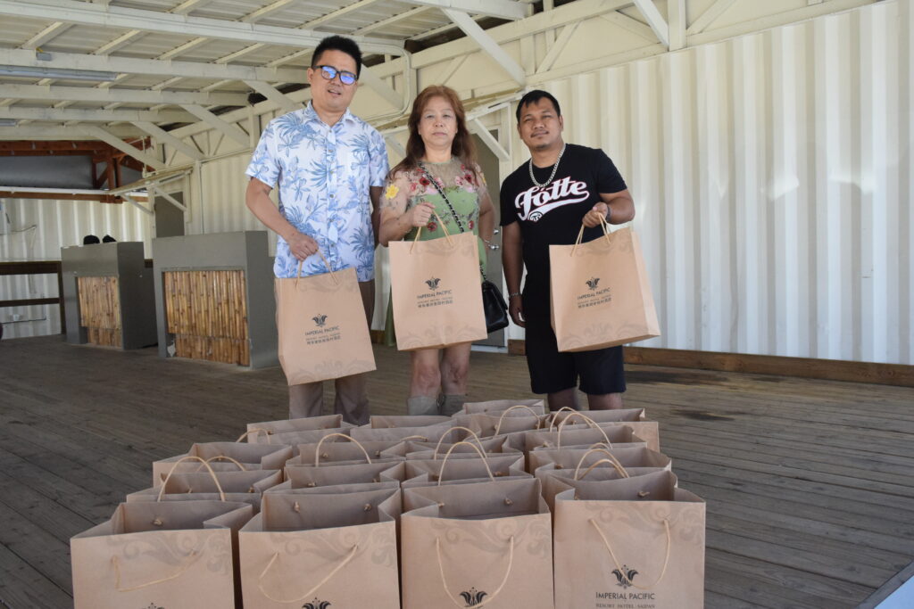 Imperial Pacific International major shareholder Cui Li Jie, center, human resource business partner How Yo Chi and Mel Manglona, a staff member of Sen. Paul Manglona’s office, hold bags of groceries at the Saipan commuter terminal on Saturday.