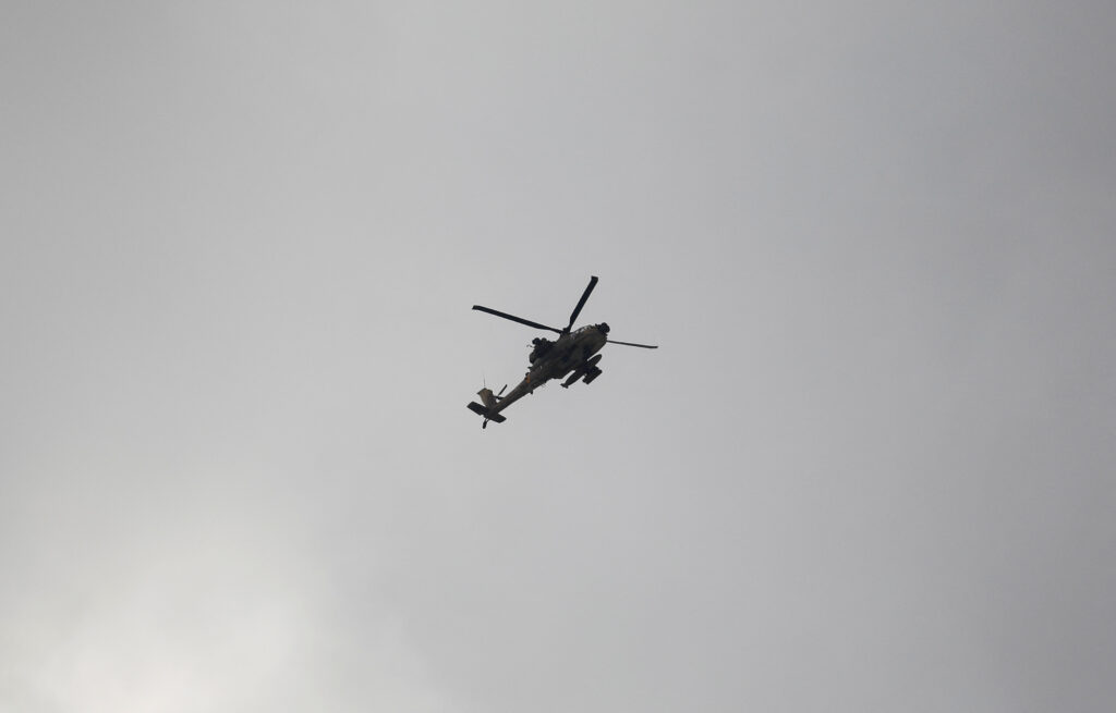 A helicopter flies during an Israeli raid in Jenin, in the Israeli-occupied West Bank June 19, 2023. REUTERS/Raneen Sawafta