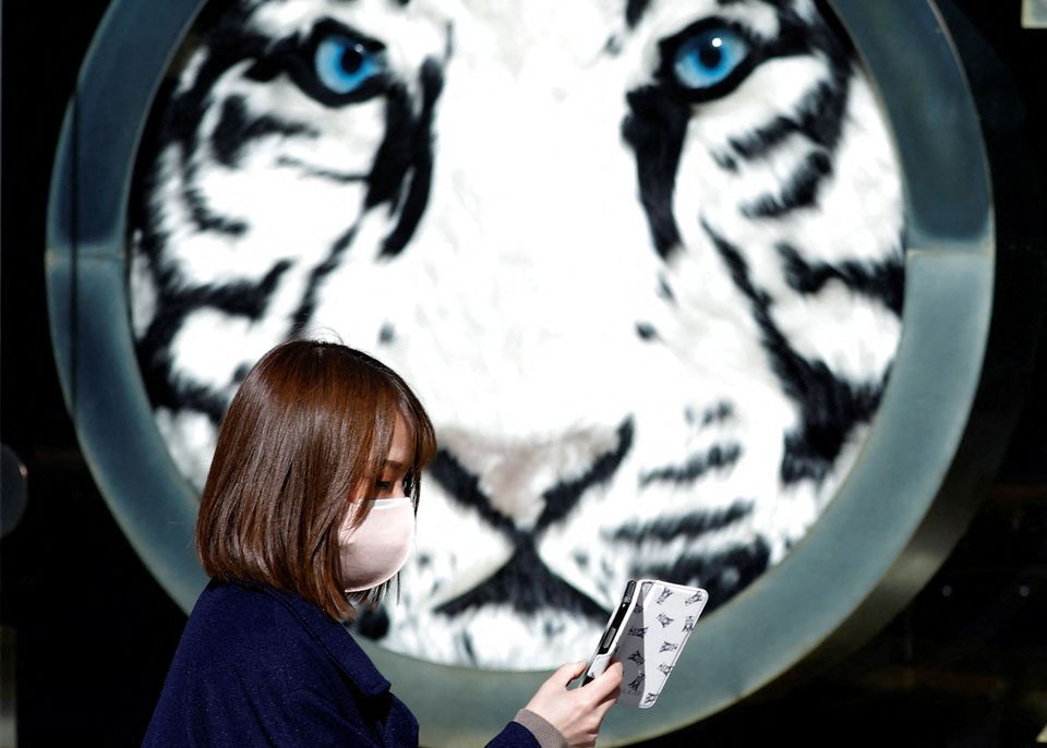 A woman wearing a protective mask walks past a show window of a department store at a shopping district in Tokyo, Japan, Jan. 18, 2022. 2022 is the Chinese Lunar New Year of the Tiger.