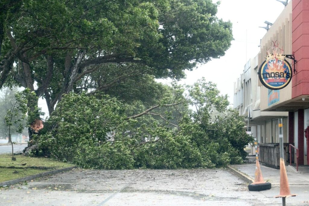 A fallen tree blocks the road in front of Mosa’s in Hagåtña as Typhoon Mawar approached the Mariana Islands Wednesday.