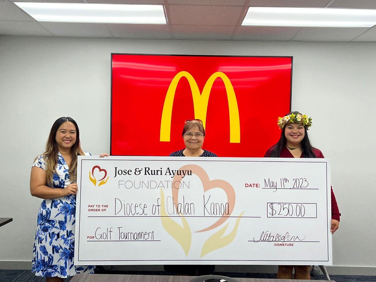 The Jose and Ruri Ayuyu Foundation donated $250 to sponsor a hole for Immaculate Heart of Mary Chapel Fundraising Golf Tournament held on May 13, 2023 at LaoLao Bay Golf Resort West Course. The Jose and Ruri Ayuyu Foundation or JRA is newly founded by President Jose Ayuyu and Vice President Marcia Ruri Ayuyu of McDonald’s of Guam and Saipan. The JRA foundation is non-profit charitable organization dedicated to promoting active lifestyles and funding programs that support children and families in need through Micronesia. The foundation is proud to donate to Immaculate Heart of Mary Chapel as they are fundraising to renovate their chapel structure, used to house families during natural disasters, for daily devotional prayers, young children to receive their First Holy Communion, Confirmation and some preparation for adult baptism and marriage.