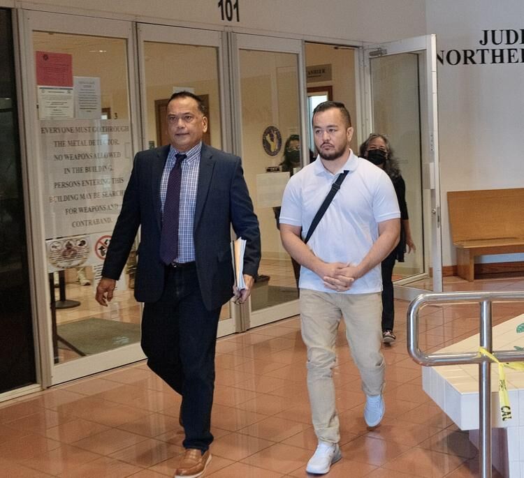 Justin Benavente, right, and defense attorney Joaquin “Jay” Arriola Jr. leave the Judiciary of Guam Northern Court Satellite in Dededo after Benavente’s arraignment Nov. 15, 2023.