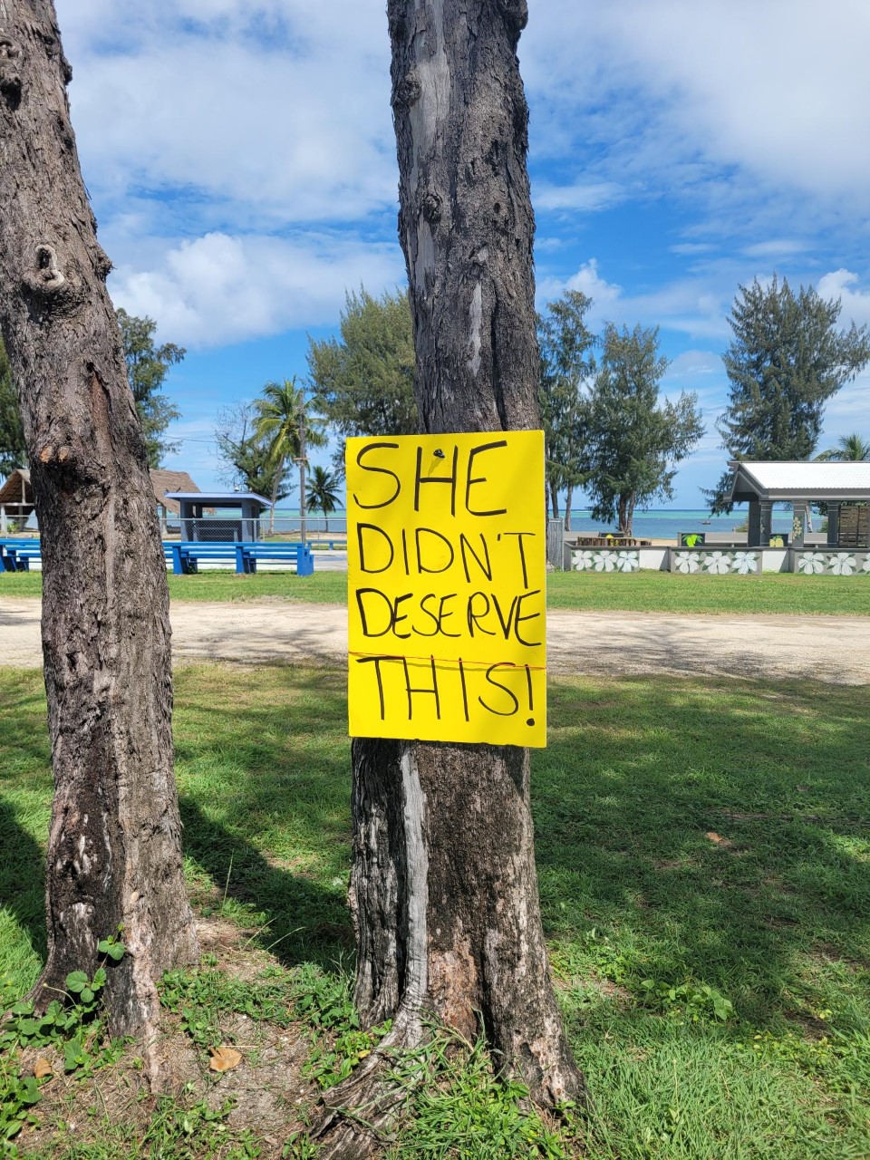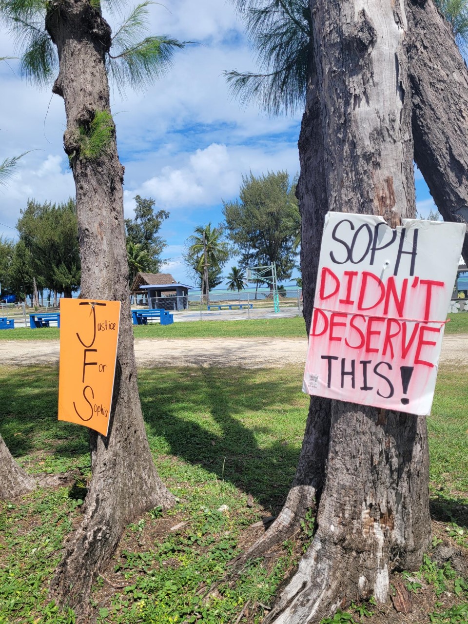 Signs and banners installed by the friends and family members of Sophia Aldan Demapan are seen in the Civic Center area across from the judicial building and police headquarters in Susupe.