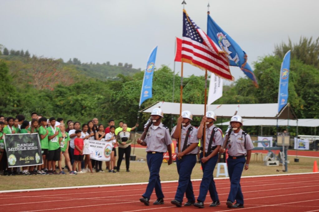 The Kagman High School Color Guard exhibited exceptional professionalism and proficiency as they proudly presented the colors at the annual Track & Field event held at the Francisco Track in Oleai, on Friday, May 5, 2023. The event was the middle school and high school championships. The Kagman High JROTC Color Guard consisted of four leading members; C/SGT Damian Torres who was the right guard, C/2LT Manuel Babauta who held the U.S. flag, C/1SG Jarrod Muna who held the CNMI flag, and C/2LT Kody Palacios who was the right guard. Their patriotic touch added to the event’s success, highlighting their dedication and skill. Overall, the Kagman High School Color Guard Team’s performance contributed to the successful and memorable occasion, demonstrating their unwavering commitment to excellence for the JROTC program.