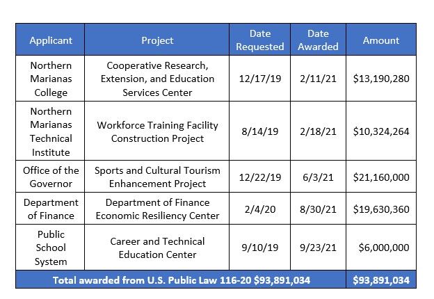 Funding for the EDA recovery grants and eligibility for the Marianas was included in U.S. Public Law 116-20 in June 2019 at Congressman Sablan’s request. Within a few months, Commonwealth agencies had submitted seven grant applications. But the Trump administration failed to act. Only one application — $10.7 million for Northern Marianas College — received approval.