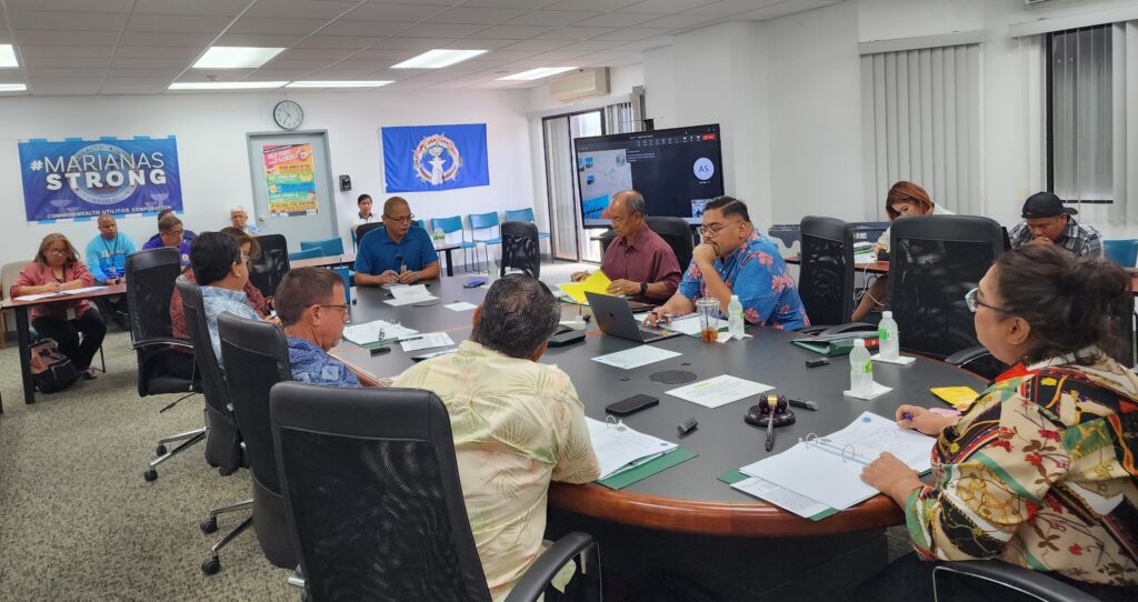 Rep. Vince Seman Alda, center background, speaks during the Commonwealth Utilities Corp. board meeting on Friday.