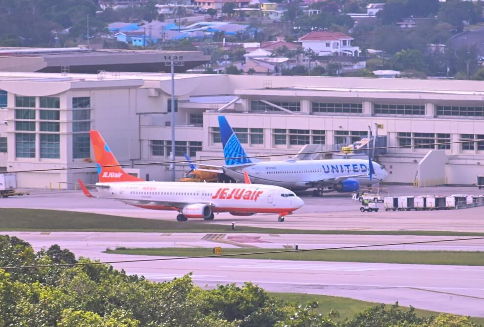 A Jeju Air plane taxis to a jetway after landing April 3, 2023, at the A.B. Won Pat International Airport in Tiyan.