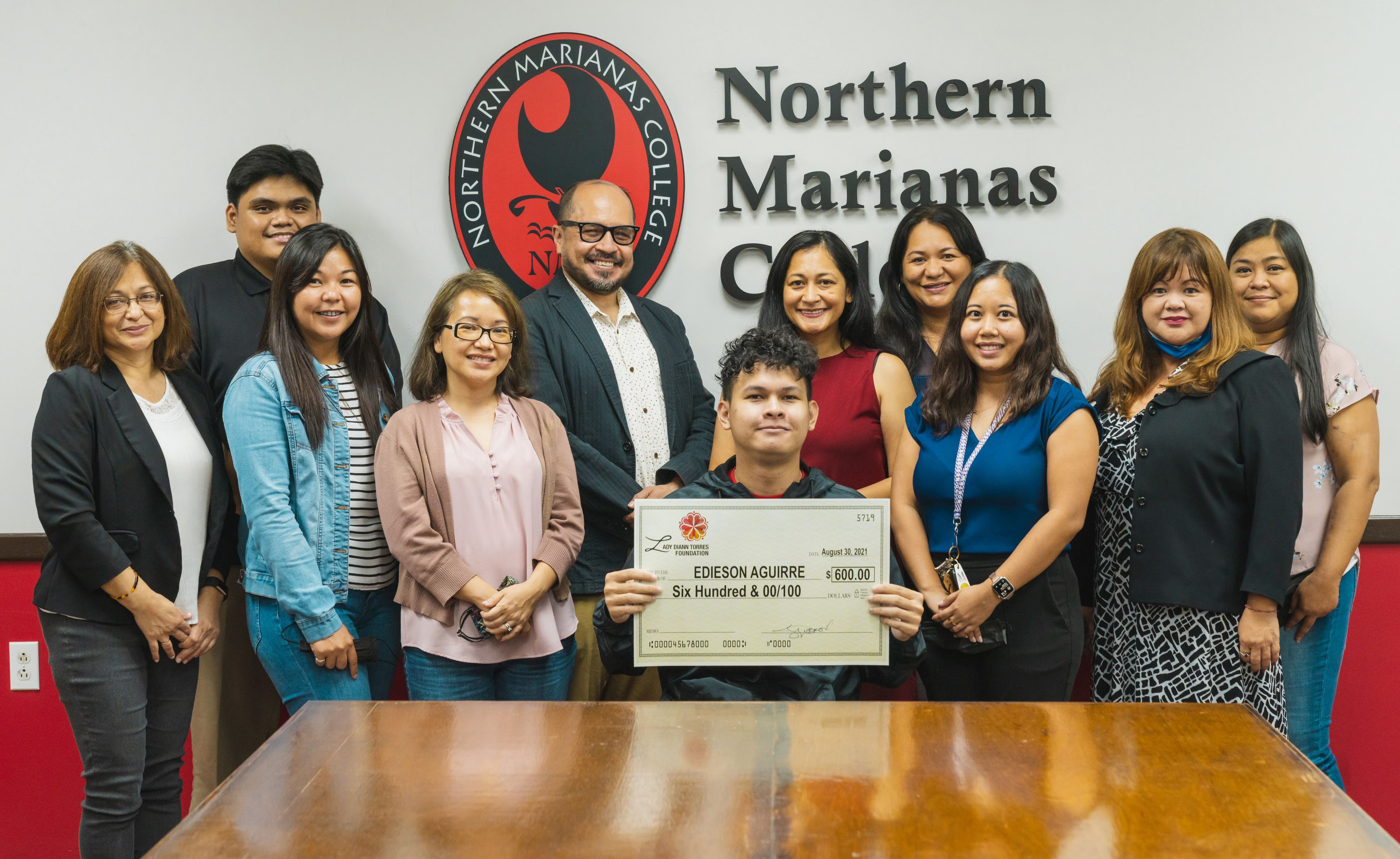 Northern Marianas College students Edieson Aguirre and Avry Racoma were recently awarded $600 each from the Lady Diann Torres Foundation. The LDTF scholarship program is aimed at giving individuals with disabilities more opportunities at pursuing higher education at NMC. In both photos with the scholars are NMC President Galvin Deleon Guerrero, first lady Diann Torres, LDTF board member and NMC regent Irene Torres, NMC Dean of Student Support Services Charlotte Cepeda, NMC counselor Roxanne Torres, NMC Learning Support Services Director Christine Inos, NMC counselor Kaelani Demapan, NMC Financial Aid Specialist Roy Alegre, NMC Financial Aid Director Daisy Manglona-Propst and LDTF board member and NMC federal accountant Katherine Palacios.