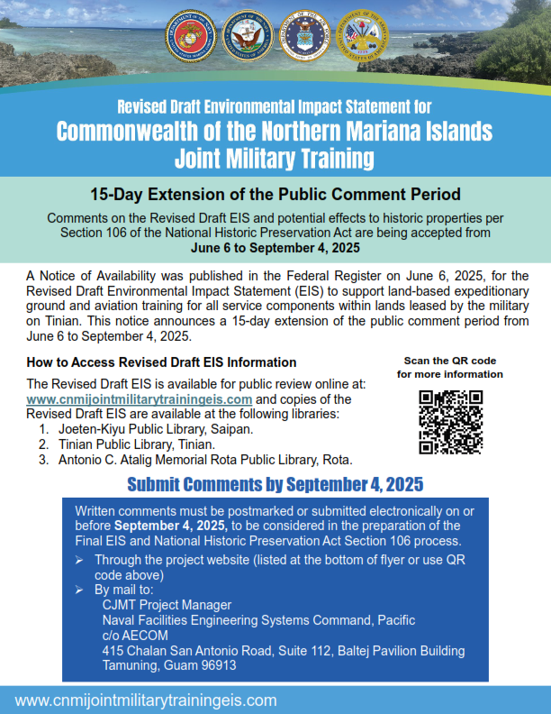 (Office of the Governor) — There will be a 15-day extension of the public comment period for the Commonwealth of the Northern Mariana Islands Joint Military Training-Revised Draft Environmental Impact Statement or CJMT-EIS.