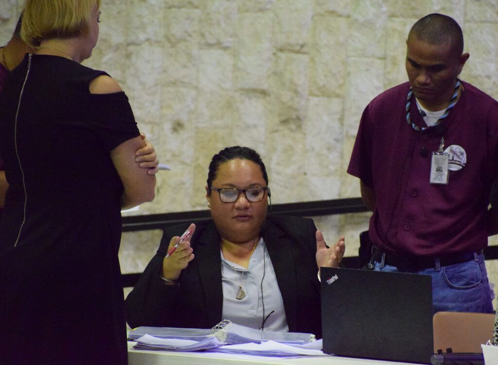 Zoning Administrator Geri Dela Cruz, center, gestures, as she speaks with Zoning Board Chairwoman Tatiana Babauta, left, and a Zoning Office staffer during a public hearing at the multi-purpose center on Wednesday. Photo by Emmanuel T. Erediano