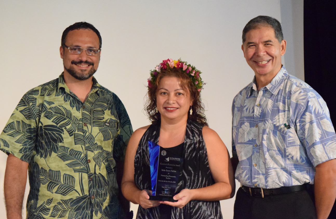 Anita Mae Ayuyu Sablan, center, with Northern Marianas Humanities Council Executive Director Leo Pangelinan, left, and chairman Robert Torres. Photo by Emmanuel T. Erediano