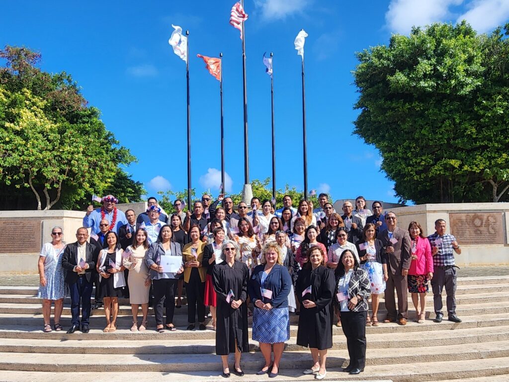 The new U.S. citizens are: Geraldine R. Acoba, Elli A. Aguilar, Mercita S. Alejandre, Ricardo P. Ansay, Jhovie Kate A. Asuncion, Nora J. Ayuyu, Aldritz D. Buensalido, Dolores B. Castro, Bernadita G. Catana, Noel I. Conti, Mila A. Cultura, Nolan B. Cultura, Manuel C. Dacuma, Fatima Louise H. Decano, Jamin Daniel C. Dela Cuz, Frederick T. Fatialofa, Paulina L. Garcia, Rolando M. Gatchalian, Andres V. Halaby, Randy A. Jacob, Jihyun Kim, Thony Joy P. Mabini, Cristina F. Magofna, Orlando T. Mallari, Rosemarie S. Maratita, Emma A. Montenejo, Jojie A. Montenejo, Noelito M. Ong, Paloma V. Ong, Maria Cecilia A. Puguon, Nikko C. Puguon, Teresita S. Ramos, Virgilio F. Ramos, Aileen M. San Nicolas, Marian F. Santos, Restituto P. Santos, Savannah Gayle F. Santos, Maria Pinky R. Tentia, Helen V. Tiples and Lilio B. Tiples.