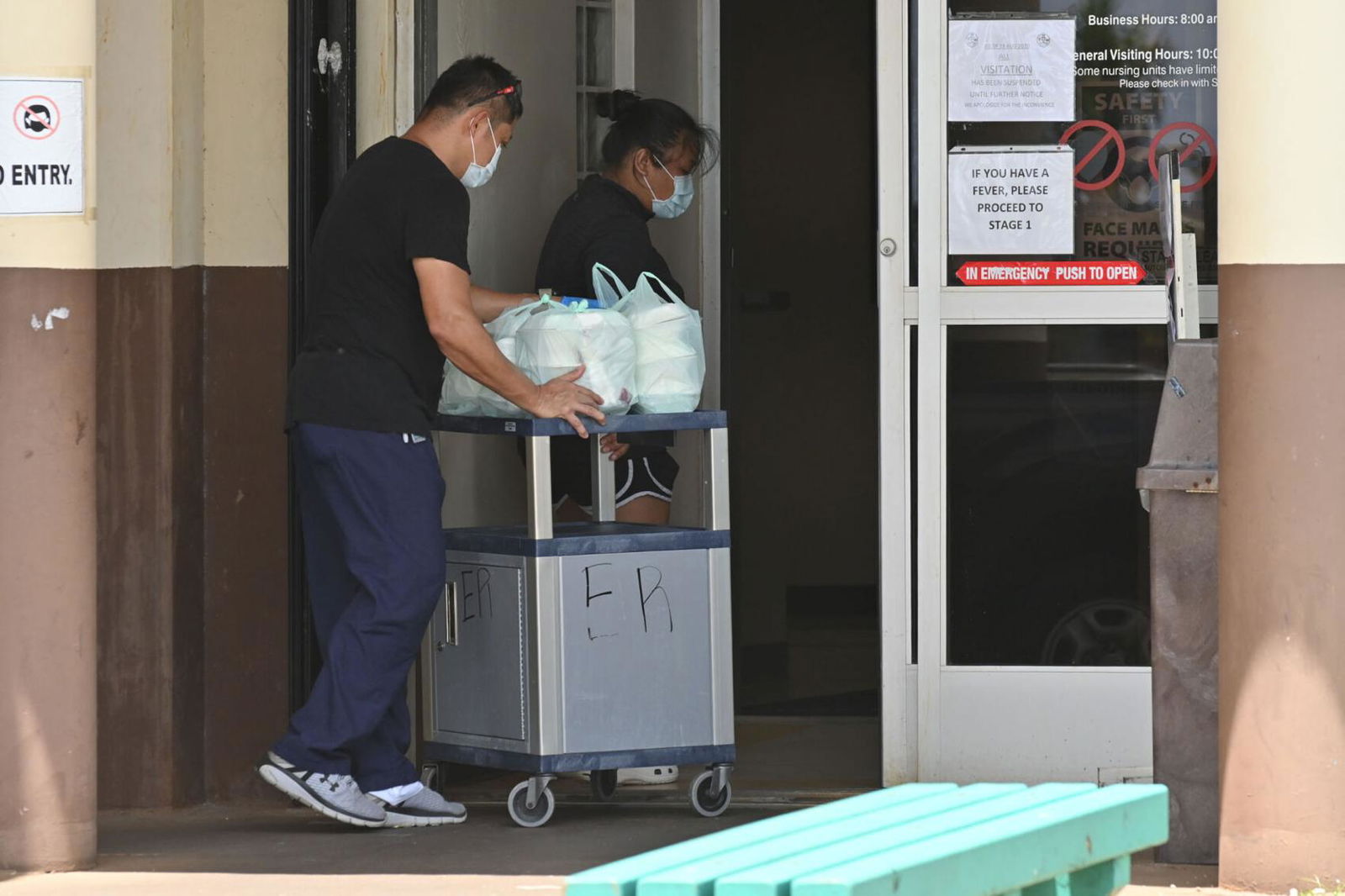 Several people wheel in a food cart into the front entrance of Guam Memorial Hospital on Sept. 24, 2020 in Tamuning. Photo by David Castro/The Guam Daily Post