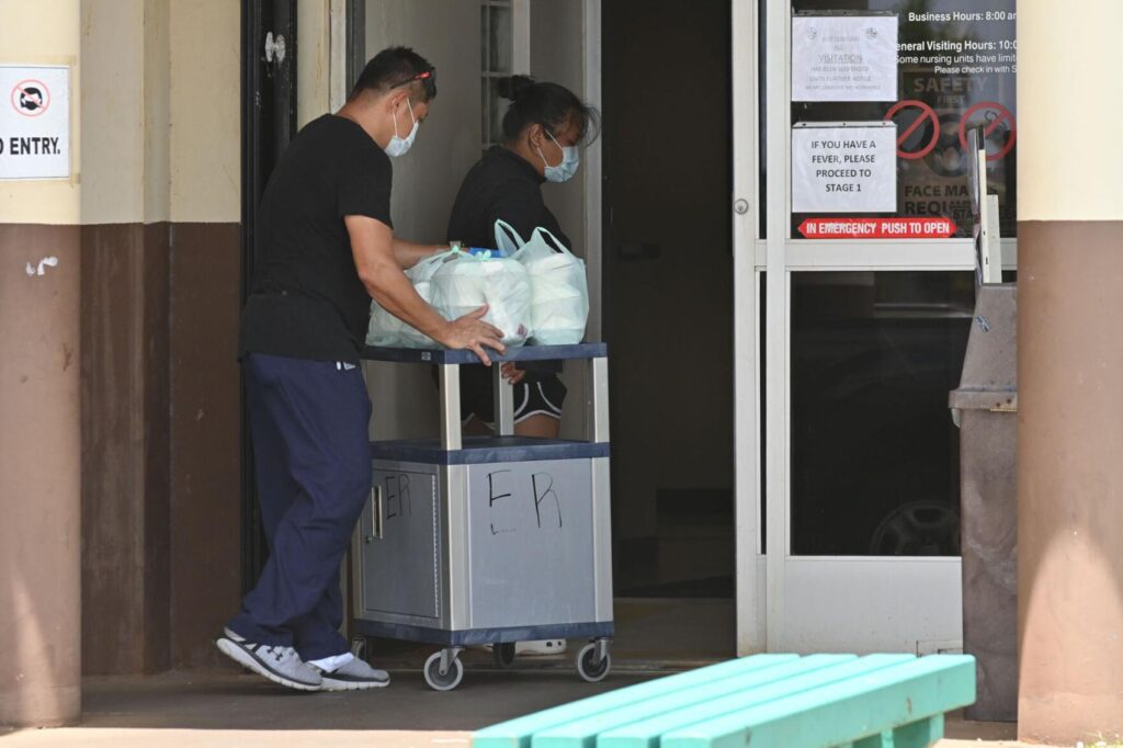 Several people wheel in a food cart into the front entrance of Guam Memorial Hospital on Sept. 24, 2020 in Tamuning. Photo by David Castro/The Guam Daily Post