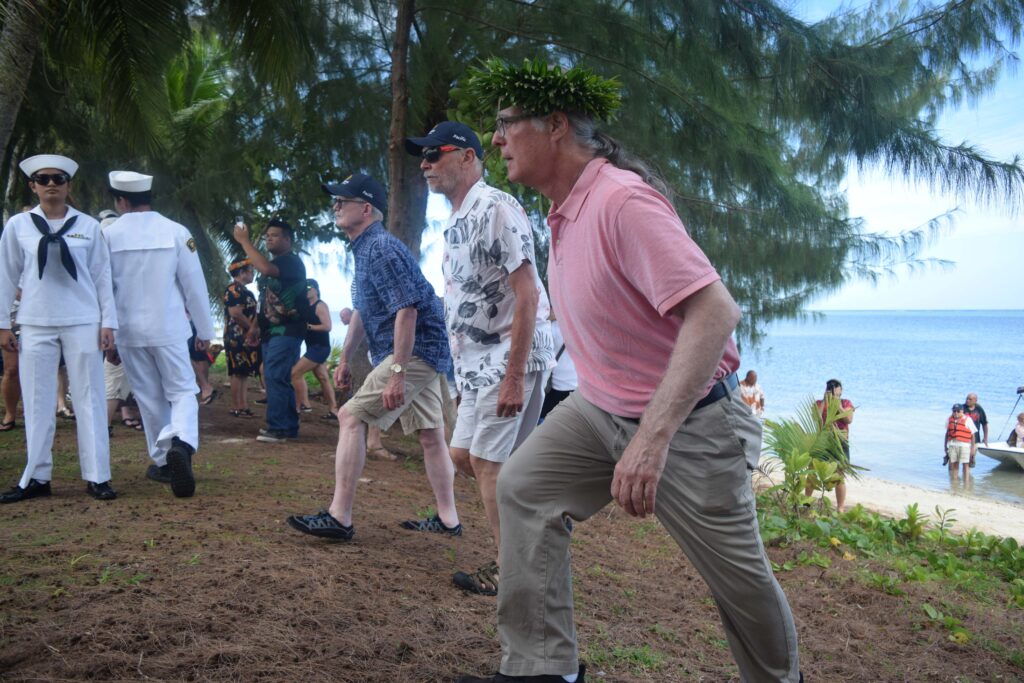 The governor and Lt. Gov. David M. Apatang witnessed Jack Padley, William Michels and Dave Knisley walking the same path that their fathers took as they disembarked from the military vessels that landed on the beach on June 15, 1944.