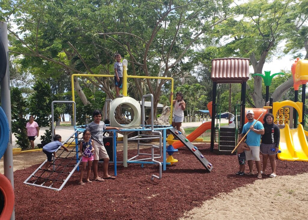 Rep. Joel Camacho, right, poses with children at the newly completed playground at Paupau Beach that he and former Rep. Alice Igitol initiated. Contributed photo
