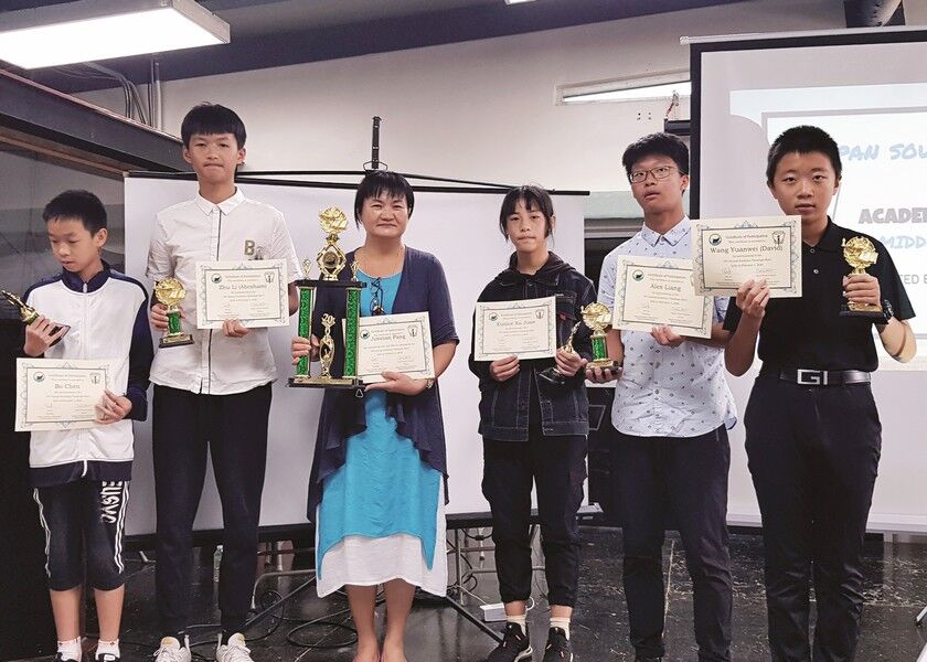 Agape Christian School topped the 18th annual Academic Challenge Bowl hosted by the Saipan Southern High School National Honor Society on Saturday. From left, Bo Chen, Zhu Li, ACS principal and coach Jimean Pang, Eunice Xu Juan, Alex Liang and Wang Yuanwei. Photo by Lori Lyn C. Lirio