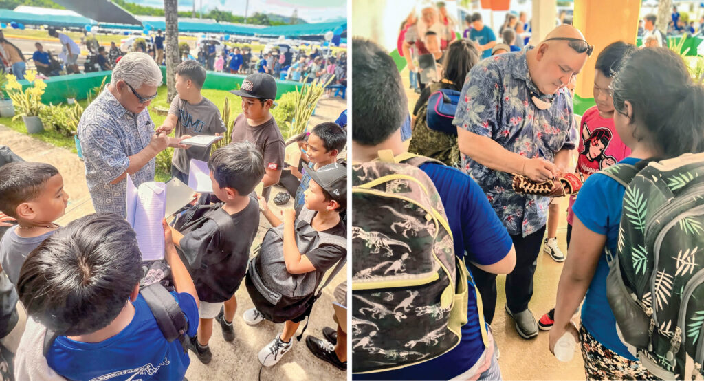 Kagman Elementary School students greet Gov. Arnold I. Palacios and Commissioner of Education Dr. Lawrence F. Camacho during the unveiling of the Public School System’s multi-million-dollar cutting-edge alarm and safety bell system on Oct. 4, 2024. Eager for autographs from the two officials, students lined up with notepads, mitts, and even knapsacks in hand.