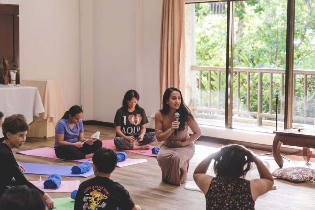 Asia Hilario speaks at a local sound healing event she hosted.