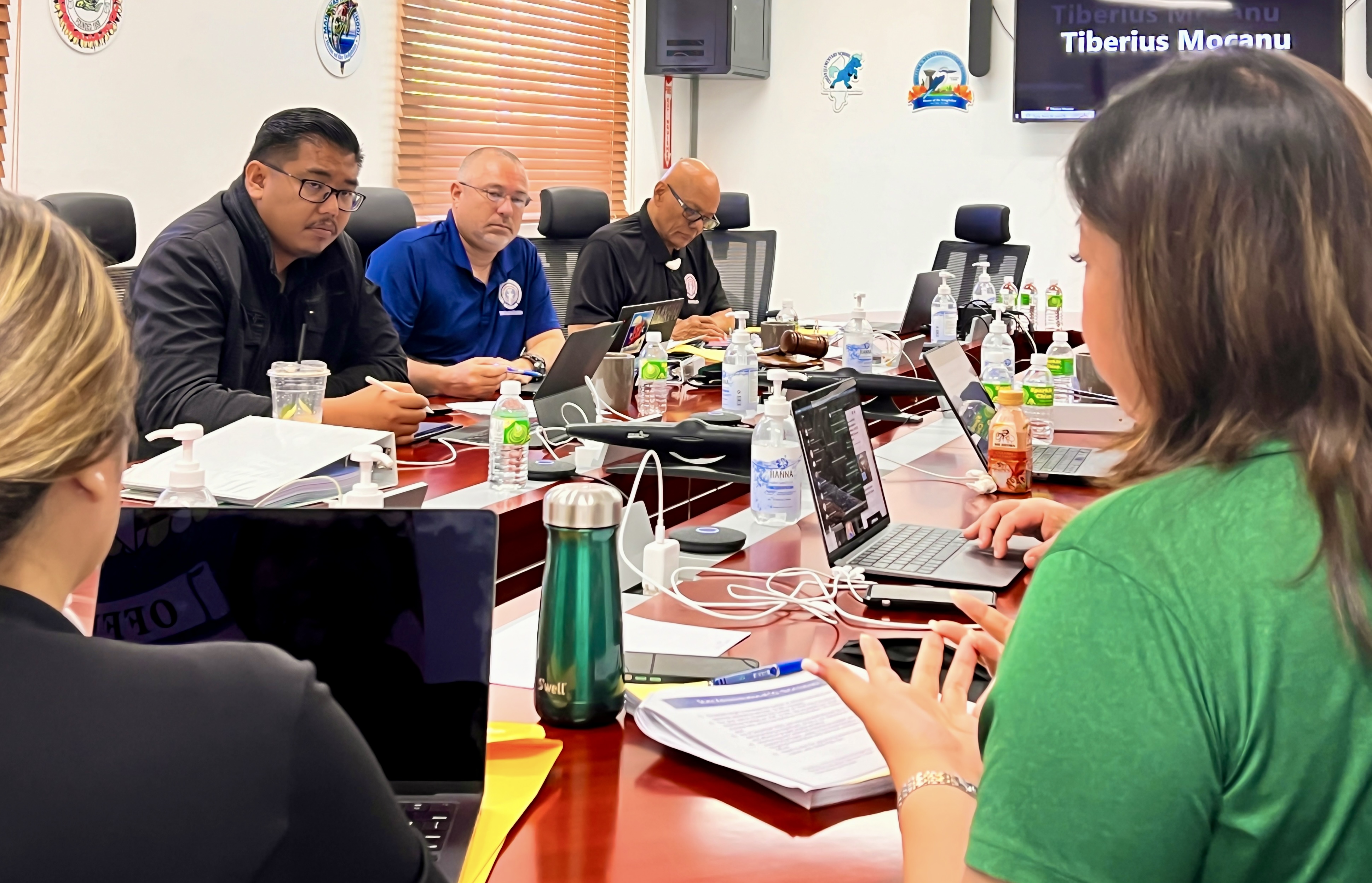 The Public School System’s Federal Programs Officer Jacqueline Che, right, back to the camera, and Finance and Budget Director Arlene Lizama, left, back to the camera, meet with the Board of Education’s Committee on Fiscal, Personnel and Administration on Thursday, The committee is headed by Gregory Pat Borja, and its members are Antonio M. Borja and Herman Atalig, the BOE chairman.