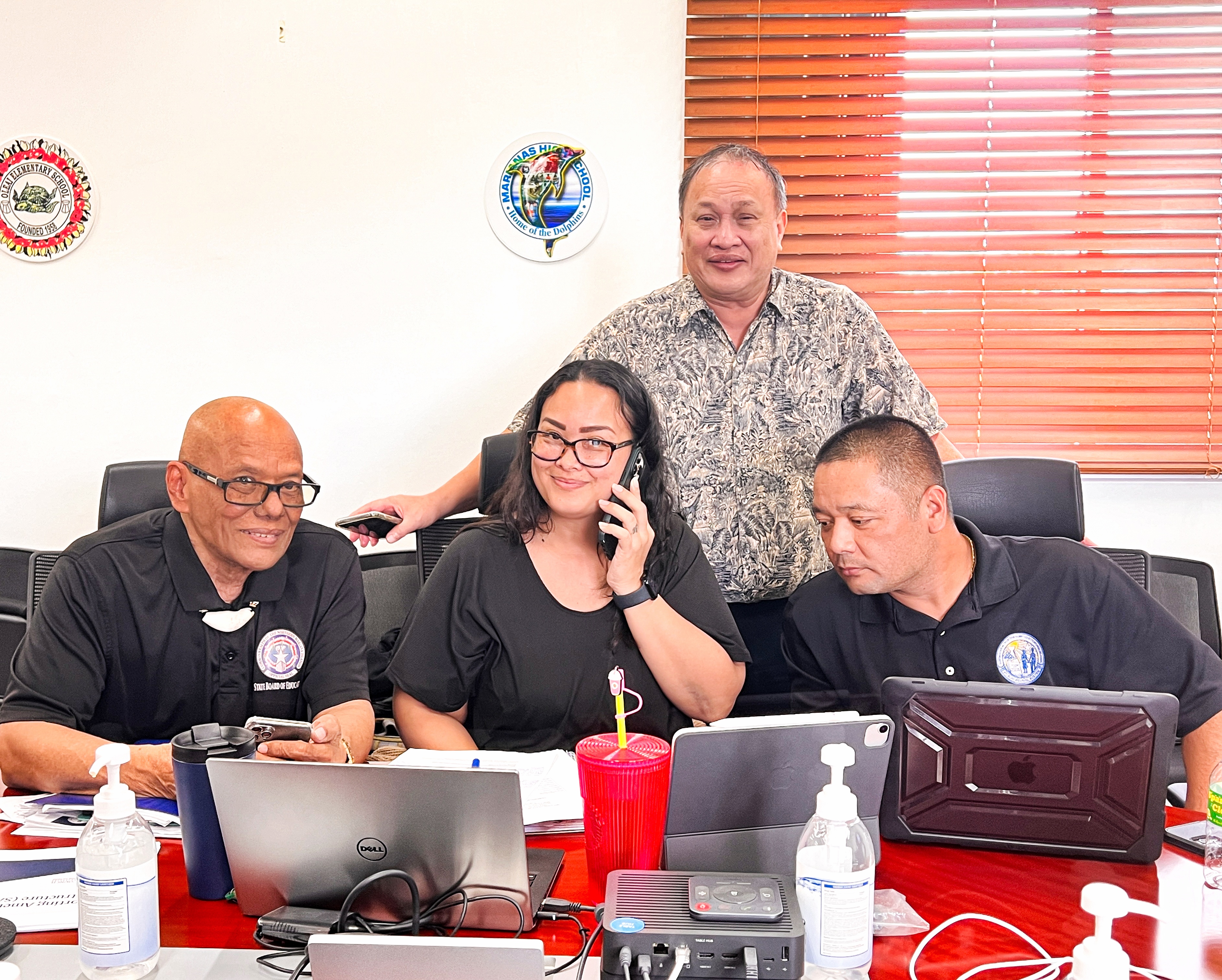 Board of Education Chair Herman Atalig, left, with BOE Internal Auditor Jolene Muna, center, State Technology Director Jesse Tenorio, right, and Board Member Andrew L. Orsini, standing, prior to the start of Monday’s special meeting on Capital Hill.