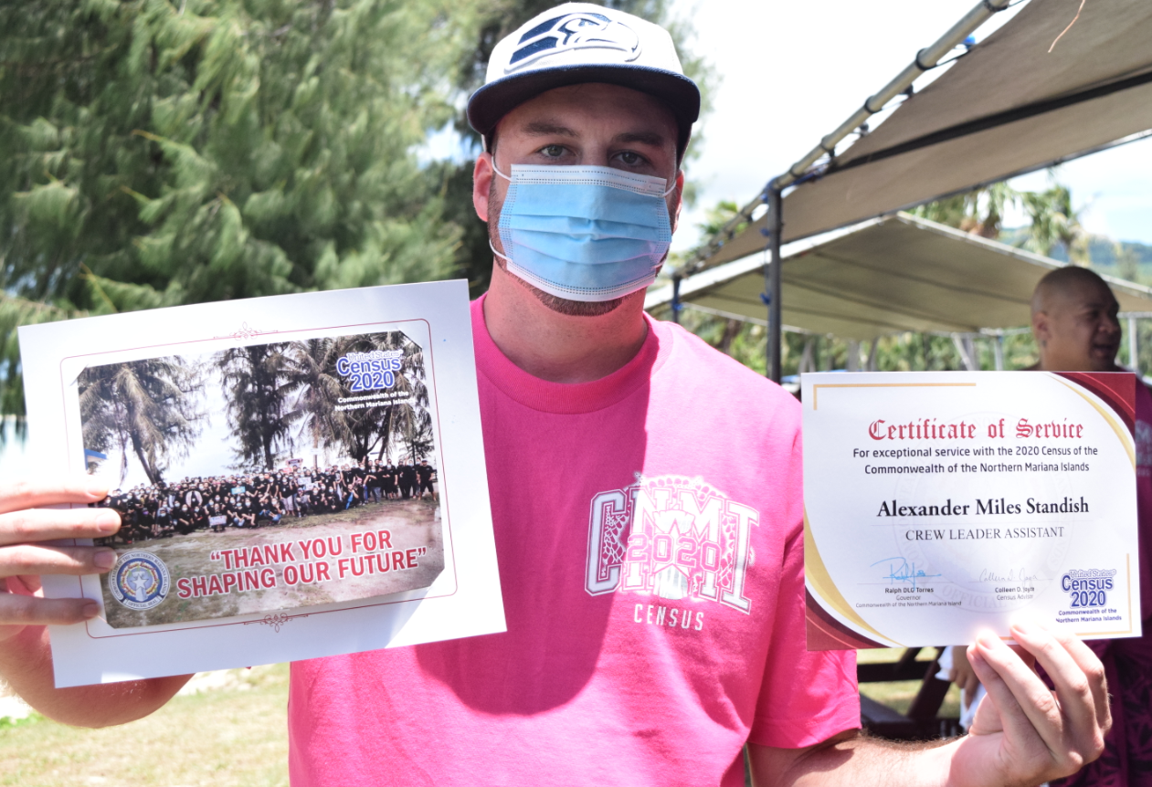 CNMI Census 2020 crew leader assistant Alex Standish shows his certificate of appreciation during the appreciation picnic at Kilili Beach on Saturday. Photo by Emmanuel T. Erediano