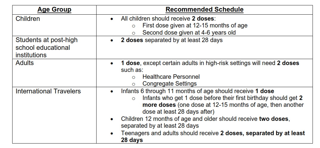 Your best protection against measles is vaccinations. The CDC recommends that people get the MMR (Measles, Mumps, and Rubella) vaccine. The vaccine recommendation is as follows: