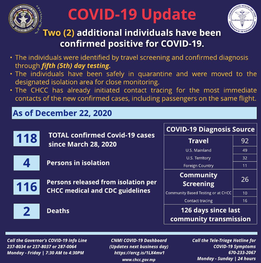 This brings the CNMI’s total to 118 cases since March 28, 2020. Four are currently in isolation.