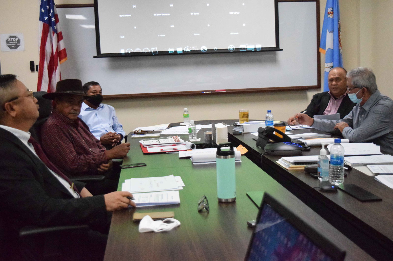 Commonwealth Casino Commission Chairman Edward C. Deleon Guerrero, right, background, speaks as Commissioner Diego Songsong, right, Vice Chairman Ralph S. Demapan, third left, Commissioner Ramon Dela Cruz, second left and Executive Director, Andrew Yeom, left, listen during a meeting in the CCC conference room in Gualo Rai on Tuesday. Photo by Emmanuel T. Erediano