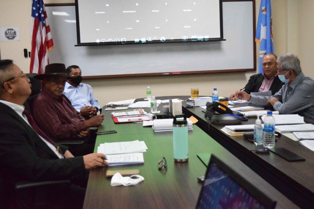 Commonwealth Casino Commission Chairman Edward C. Deleon Guerrero, right, background, speaks as Commissioner Diego Songsong, right, Vice Chairman Ralph S. Demapan, third left, Commissioner Ramon Dela Cruz, second left and Executive Director, Andrew Yeom, left, listen during a meeting in the CCC conference room in Gualo Rai on Tuesday. Photo by Emmanuel T. Erediano