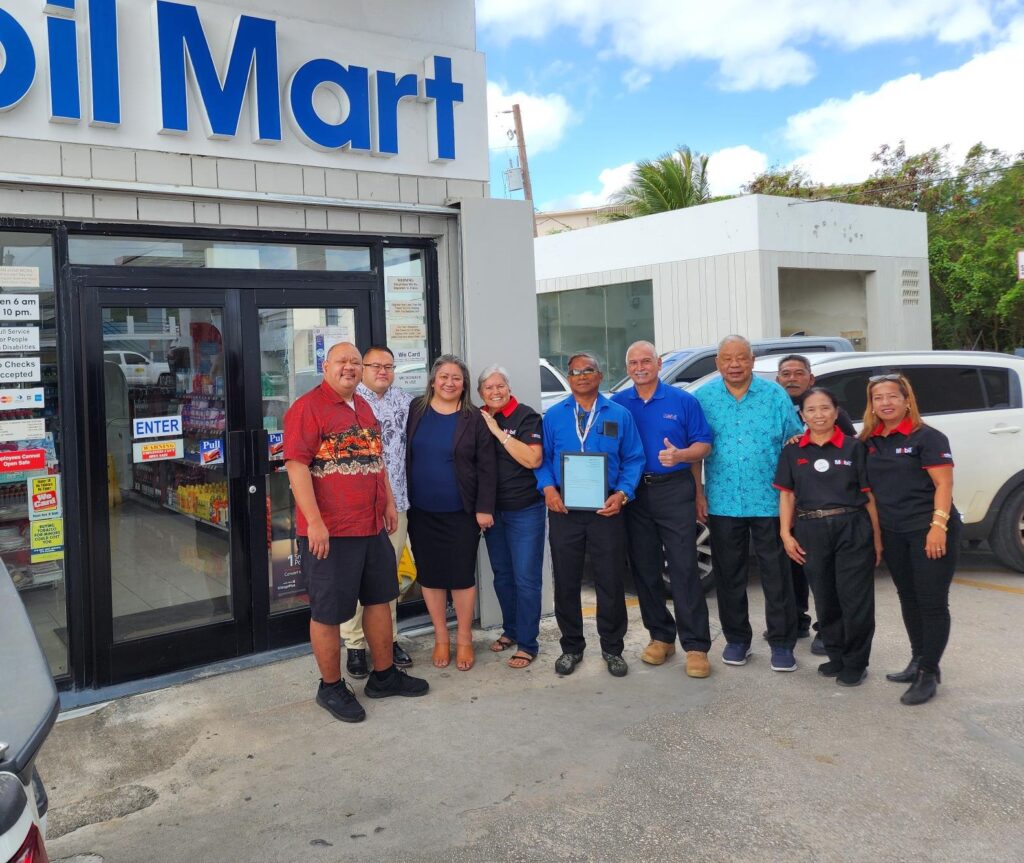 Max Aguon, 5th right, poses for a photo on Saturday with Rep. John Paul Sablan, Rep. Manny Castro, Senate President Edith Deleon Guerrero, Lt. Gov. David M. Apatang, JEMCO operators Edward and Jovita Flores, and CMG San Jose Mobil Gas Station staffers.