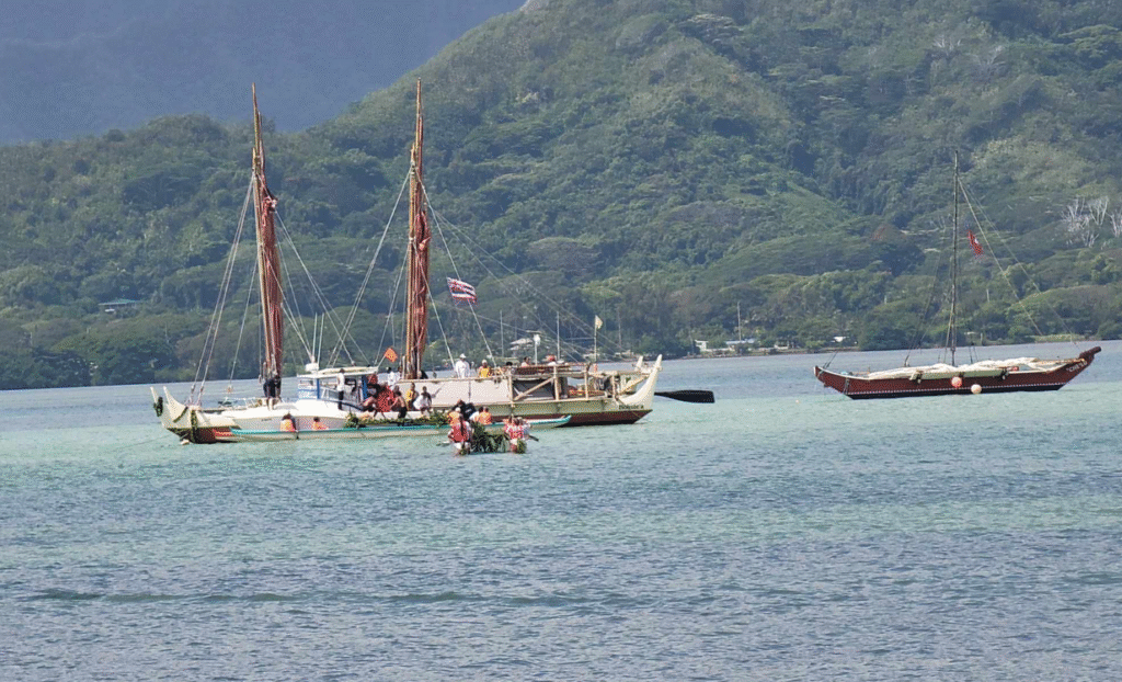 Che'lu, the 47-foot long Chamorro sailing canoe, joins the Wa’a ceremony.