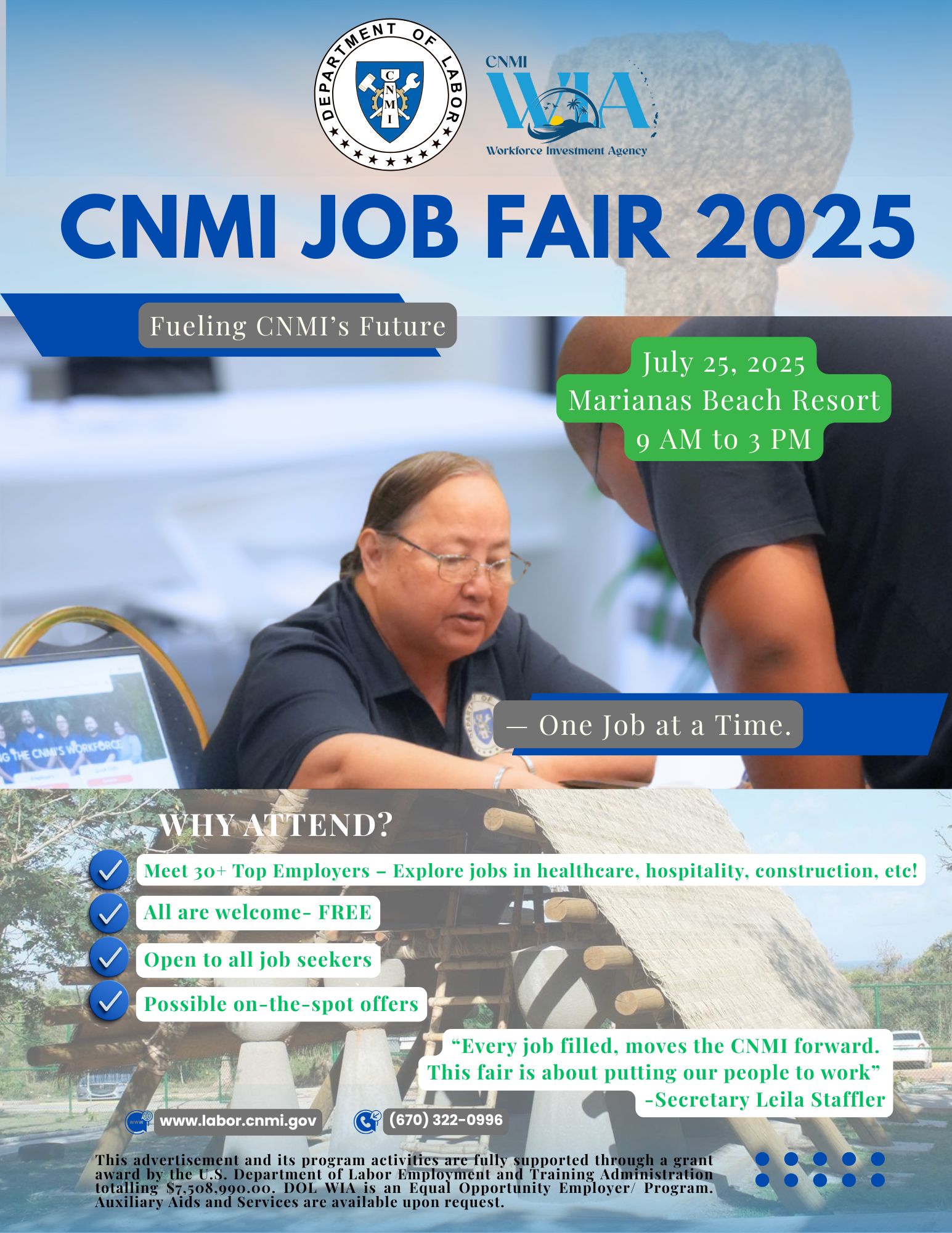 (CNMI DOL) — The CNMI Department of Labor will hold a job fair on Friday, July 25, 2025, from 9 a.m. to 3 p.m. at the Marianas Beach Resort (formerly Hyatt).