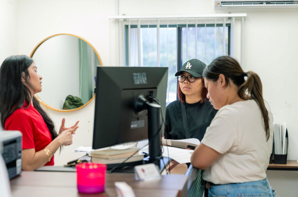 Interested applicants of the CNMI Innovation Incubator program speak with program manager Cherese Palacios, left.