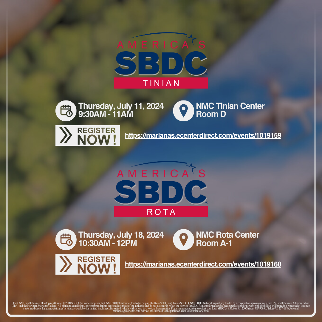 • Tinian SBDC: Thursday, July 11, 9:30 a.m. – 11 a.m., Room D, Tinian NMC Center